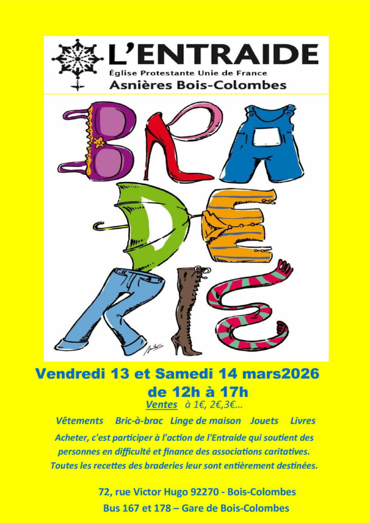 La prochaine Braderie aura lieu les Vendredi 13 et Samedi 14 Mars 2026 de 12h00 à 17h00
